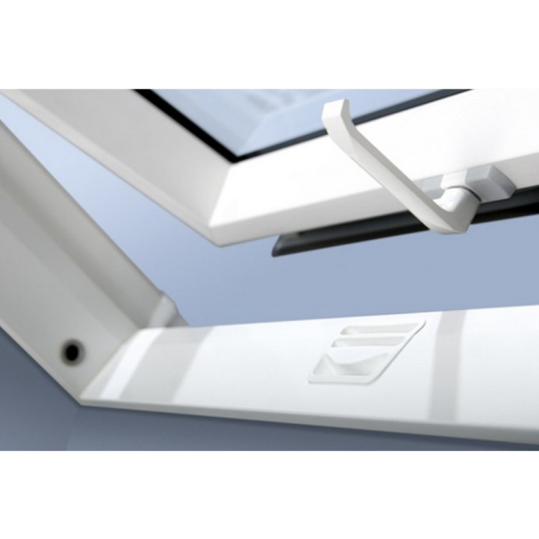 FAKRO PTP-V U4 to obrotowe okno dachowe wykonane z wielokomorowych profili PVC w kolorze białym wzmocnione rdzeniami stalowymi. Rekomendowane do pomieszczeń o podwyższonej wilgotności, np. łazienki, kuchnie. Ug=0,7, Uw=1,1.